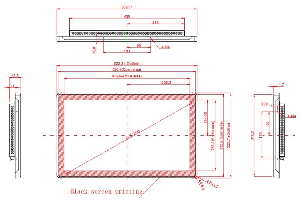 | 盖板玻璃 | 3mm黑色丝印, 物理钢化,可选AG/AR 表面处理 | |