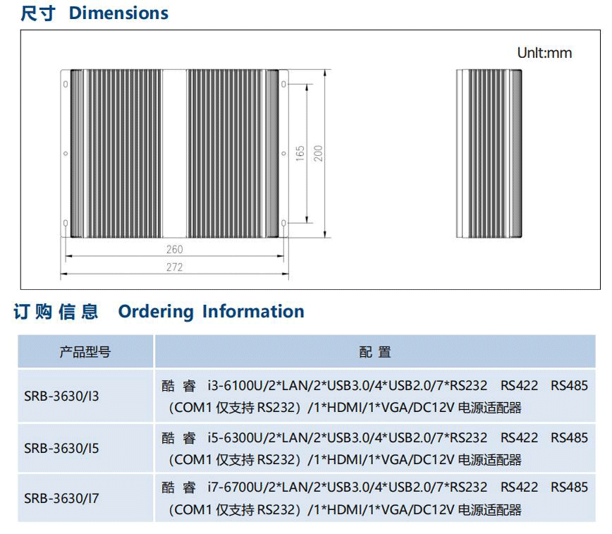 | SRB-3630/I3 | 酷 睿 i3-6100U/2*LAN/2*USB3.0/4*USB2.0/7*RS232 RS422 RS485(COM1 仅支持 RS232)/1*HDMI/1*VGA/DC12V 电源适配器 |